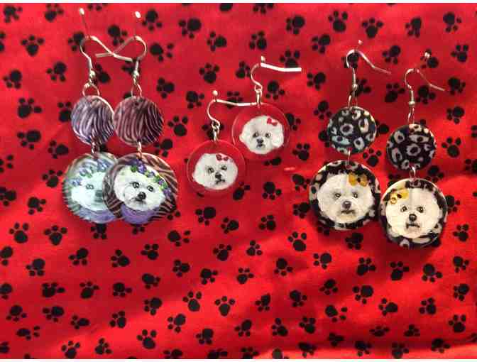 New!!! The first pair are round red disks with a cute Bichon face. The second pair are double disks, rather dangle type. With a cute Bichon face on the bottom disks. Kind of a mauve color. The third pair are double disks, rather dangle type. They are black and white background with a cute Bichon face. All Zbichons were hand painted by artist Manuela Quick, Poookie