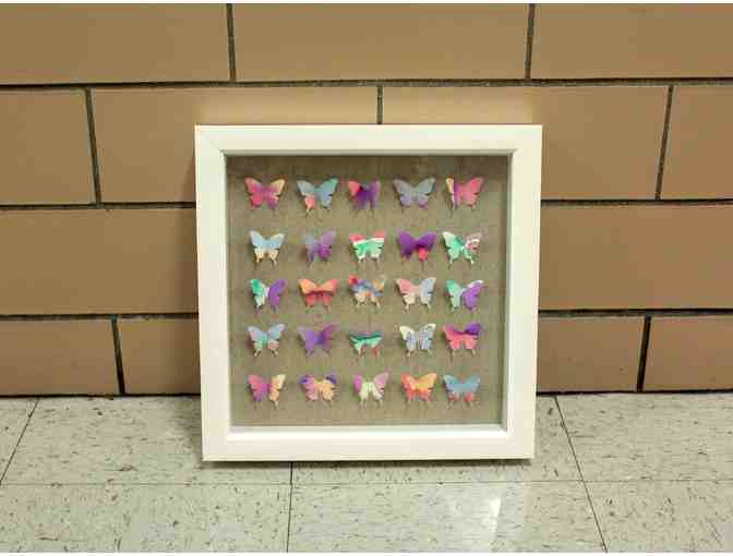 Each K-102 student created a piece of abstract art using liquid watercolors. Using a special hole puncher, students punched several butterfly shapes out of the watercolor painting and chose one for our community art project. We placed them into the shadow box. This piece is 14"x14".