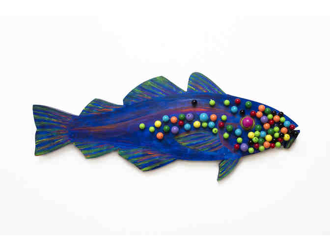Artist Statement: Beadfish was great fun to design and execute! Textural paints were used to create a magical mosaic fish of flowing fire, air, earth, and water hues. Once again I'm thrilled to contribute to the Cod Auction to support the Marblehead Festival of Arts!