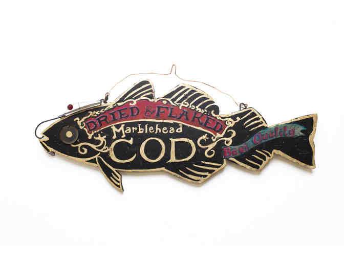 Hosting Business: “Cod for Sale” is on display at Mud Puddle Toys, 1 Pleasant St., Marblehead, MA.