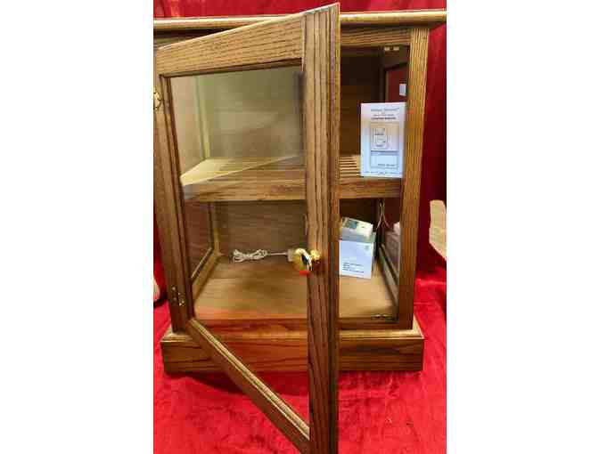 A standing cedar, glass and oak cigar humidor donated by Richard Migot Photography.