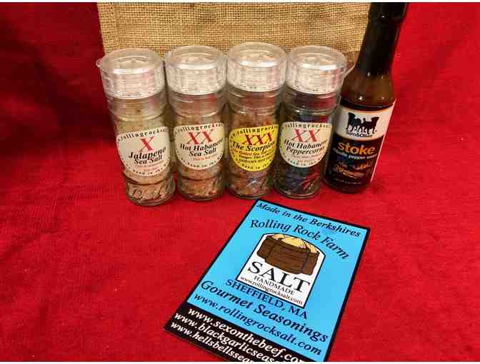 One gift box set of four specialty salt sampler collection donated by Rolling Rock Farm. Includes: