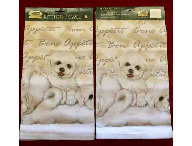 Fiddler's Elbow 17"x31" bone colored cotton towels with silk-screened pictures of dog bones, words "Bone Appetit" and puppies