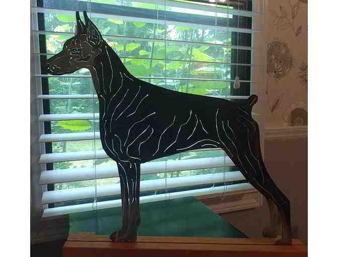 Very interesting cut out of a beautiful Doberman on a wooden stand, measures 18" x 20".   Signed by the artist (see additional picture) It says "RD Redden" 9/05 #11 ***
