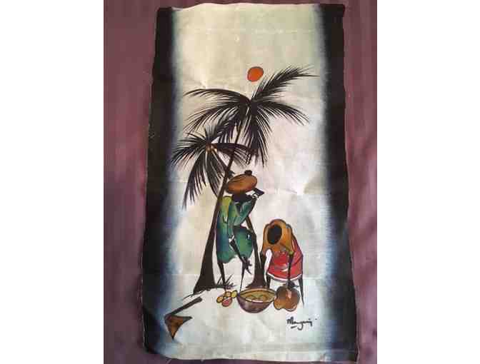 Hand-painted Batik from Uganda: "Women Preparing Food at Twilight Under Palm Trees"