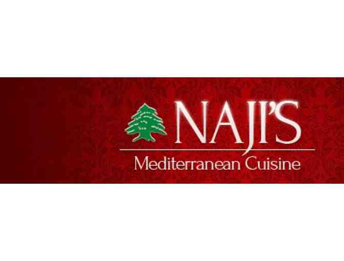 Naji's Mediterranean Cuisine, famous falafel, hummus, and kabobs. Open 7 days a week, lunch, and dinner. Indoor and outdoor covered seating. Catering all occasions!