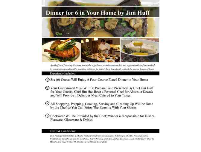 - Your Customized Meal Will Be Prepared and Presented by Chef Jim Huff for Your Guests; Chef Jim Has Been a Personal Chef for Almost a Decade and Will Provide a Delicious Meal Catered to Your Tastes.