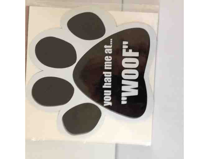 The paw print shaped decal reads: "you had me at... "Woof"