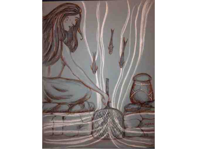 Harvest at the 'Ume Iki fishtrap: At the change of the tide, the woman wades to the fish lane and sits on the platform of a channel. Her net covers the opening. As fish rush to meet the tide, she can feel the tug of the fish in the net and quickly lifts it to catch the fish. She then stores the fish in the gourd until she has enough to feed her family for the day. Then she wades across the pond to the shore. The next day, she begins the process again. Individual families had rights to use specific lanes. 'Ume means to attract. Iki means a little, thus to take a little which is Hawaiian tradition.
