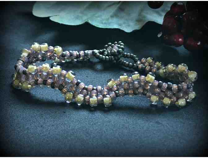 Couture creations by Clementine, this petit, earth-tone beaded, woven bracelet measures 5.25".