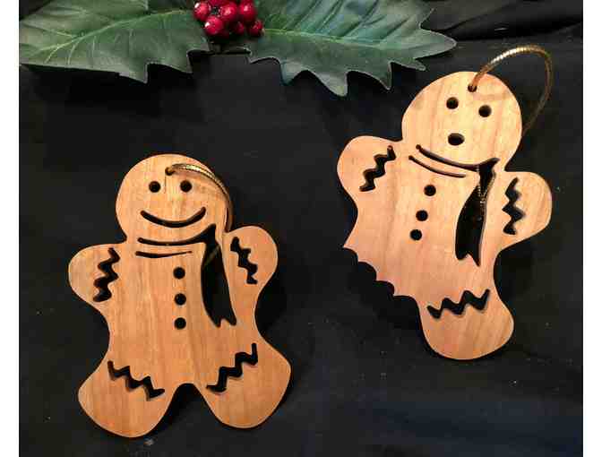 Hand-crafted Wooden Gingerbread Ornaments with a Bite Taken.  These ornaments are meticulously hand-scrolled from popular and lightly finished with a clear glaze.   The ornaments ech measure approximately 3 x 5" and are approximately 1/4" thick.