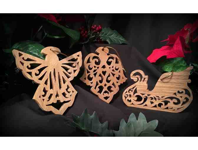A collection of hand-crafted wooden ornaments, meticulously hand-scrolled from oak, cherry and popular and lightly finished with a clear glaze. The ornaments ech measure approximately 3 x 5" and are approximately 1/4" thick.