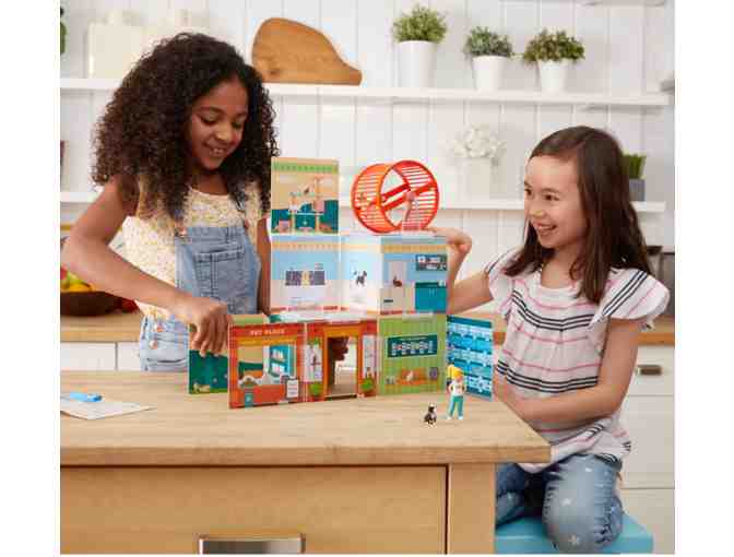 Calling all animal lovers! Kids can customize a pet paradise, including a Pet Day Care and Grooming Center, Veterinarian’s clinic, and a cool Pet Shop, featuring the town’s favorite aspiring conservationist, Izzy, and her pet dog and bunny. Spark their imagination with beautifully illustrated scenes and spaces on 12 double-sided, glossy plastic panels that clip together easily using durable plastic connectors.
