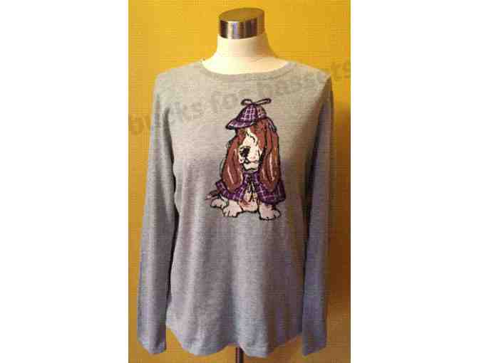Lightweight gray sweater is 60% cotton, 20% rayon, 20% nylon. Features a "detective hound" on the front. Machine wash.