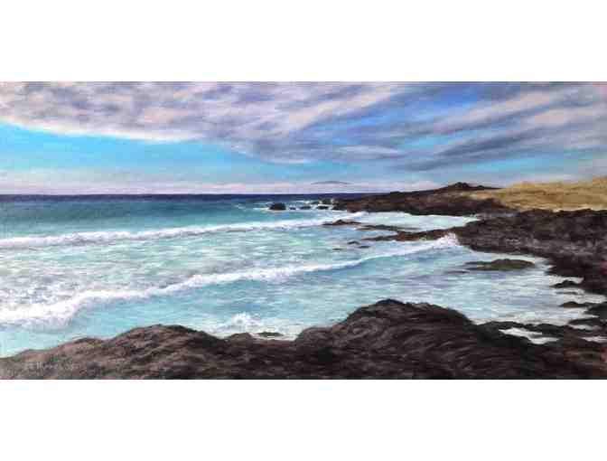 This 12"x24" oil on canvas features Manini'owali Beach, also known as Kua Bay, as a winter swell pounds the surf and Maui peers from above the cloud line in the distance.