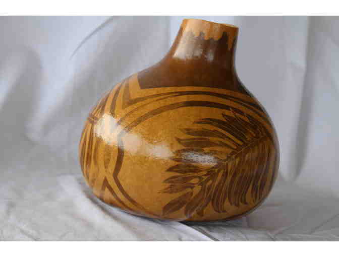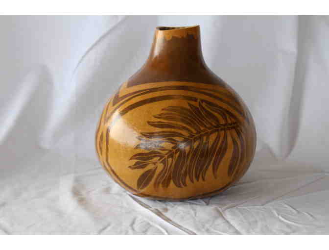 This gorgeous ipu, donated by Ipu Arts in Holualoa, is an exquisite and delicate instrument to showcase as an incredible work of art, or for making music during kanikapila. Dimensions are about 10" tall and about 10" in diameter.