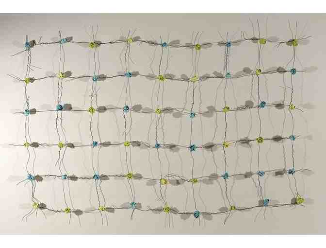 Rose Blanket by Paul Oberst (1955-2016). Steel, mixed media. Oberst was a prolific and respected artist. He was an Arts Fellow at the Fine Arts Work Center in Provincetown, MA. His artwork has been exhibited at Stux Gallery in Boston and New York, NY and resides in museums, major private and public collections nationally and internationally. He is represented by Bridgette Mayer Gallery in Philadelphia.