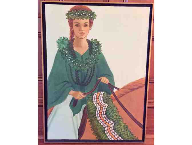 This acrylic painting is a depiction of a pa’u rider—“Molokai” done by artist Niki Fuller. Niki resides in Honolulu, and has many beautiful examples of her paintings displayed in numerous public spaces, as well as, a number of murals in prominent settings. Her work is also coveted by private collectors.