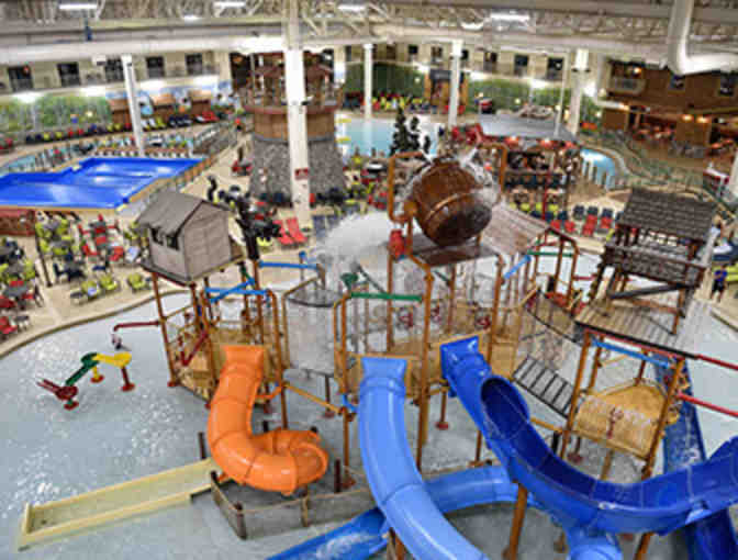 Item includes a two night stay with breakfast for both mornings for up to four people, four Adventure Park passes, Great Wolf Lodge tote, two sets of kids goggles and two Great Wolf Lodge towels.