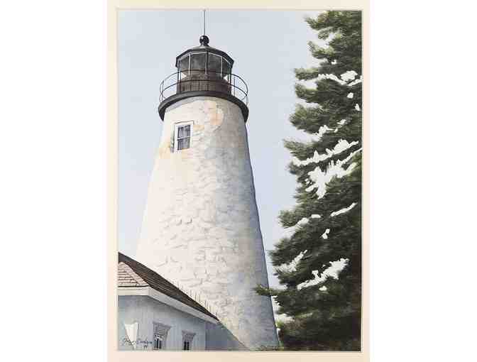 Dice Head Tower Watercolor by Gregory Dunham. Dunham was born in Belmont, MA in 1946. His works hang in collections around the world, including: The Museum of Fine Arts, Boston; Boston Public Library; Congresswoman, Chellie Pingree; Lord Dunleath, Northern Ireland; and Sir Nigel Elton Sheinwald, (Former) HM Ambassador to the United States of America, Washington, DC and London, England. 18" x 22". Value $1,000. - Susan & Jack Sullivan