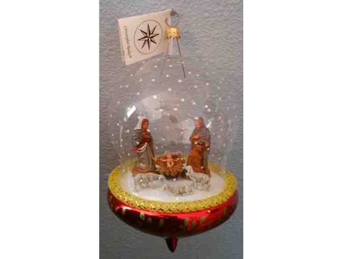 Beautiful glass encased nativity to decorate your Christmas tree. This finely crafted unique class ornament by Christopher Radko from a limited edition, was individually mouth blown and hand painted.