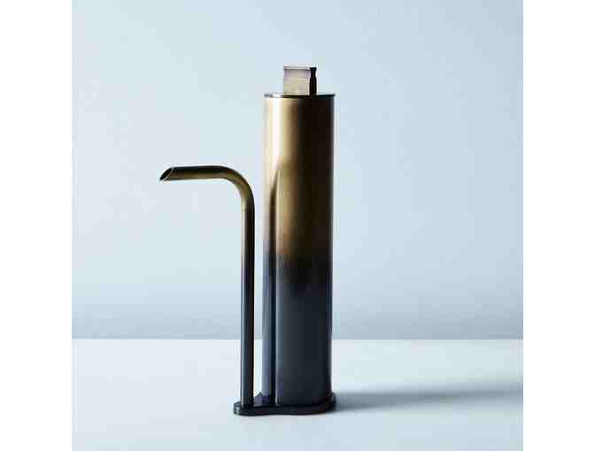 In this decanter made of hand-tarnished brass, the oil seems to move magically from the container to the spout without the two being connected. This piece, with its visual disconnects, is all about the details that exemplify the way in which designer Christopher Gentner’s mind works.