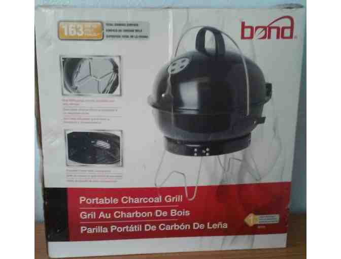 Portable charcoal grill made by Bond. Porcelain coated steel cooking grate. Dual folding legs provide portability and easy storage.