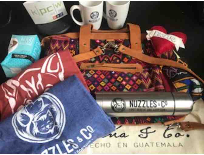 This amazing hand made Guatemalan knit bag is filled with 2 tavel coffee mugs, a pound of HUGo coffee, 2 cotton Nuzzles and Company t-shirts and a rescue cat play toy.