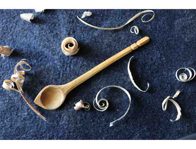 This spoon is one of a series of spoons donated by spoonmaking instructor Emmet Van Driesche of Conway, MA from a gathering of carvers at a Spoonesaurus event. It measures 8 inches long.