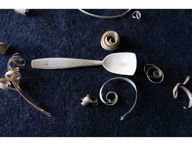 This spoon is one of a series of spoons donated by spoonmaking instructor Emmet Van Driesche of Conway, MA from a gathering of carvers at a Spoonesaurus event. This spoon measures just over 7 inches long.