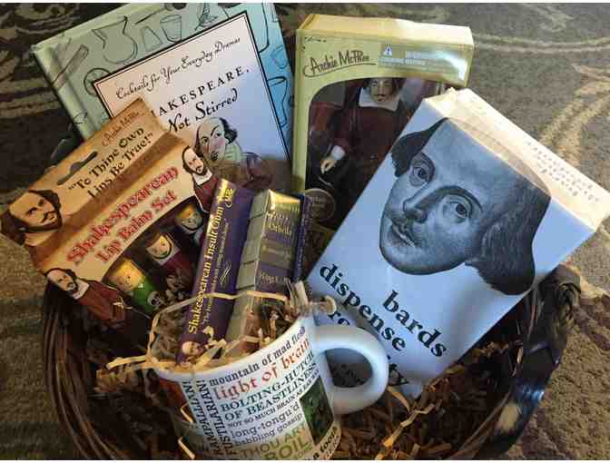 "Bolting-hutch of beastliness": gift basket includes "Bards Dispense Profanity" game, Shakespearean insult mug, Shakespearean insult gum, Shakespearean lip balm, "Shakespeare, Not Stirred" cocktail recipe book, Shakespeare action figure.