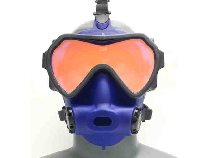 This truly functional full-face mask allows the diver to use his/her own second stage regulator, an easy way to equalize and eliminate the heavy costs associated with standard full face masks without sacrificing luxury. The mask provides a simple method to adapt your own regulator to the mask by eliminating the bite down mouthpiece and tying your own reg in with the rest of the FFM - say goodbye to jaw fatigue and dry mouth! The mask has a double seal for a better fit, five-point harness and clear communications. This one has a blue skirt/black frame and coated lens.