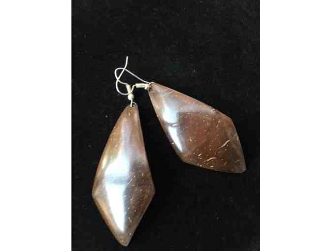 These diamond shaped earrings are cut frm a coconut shell and polished to a soft lustre. They are 2.5" from tip to tip.