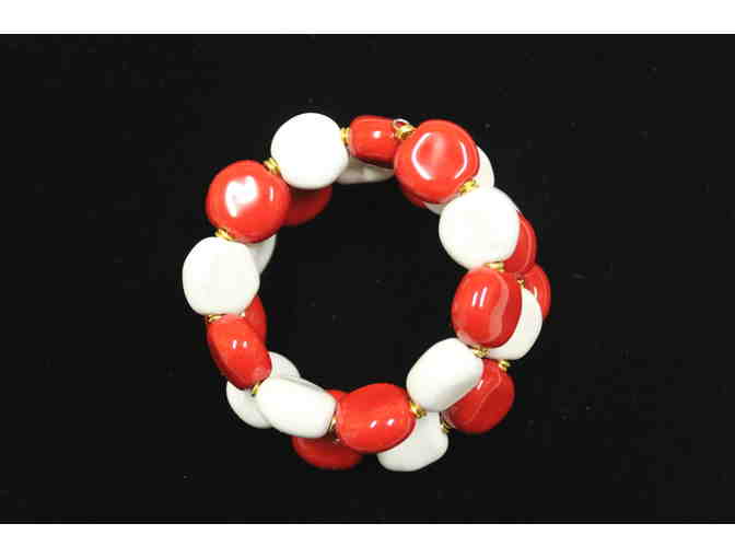 This coiled bead bracelet is handmade in Kenya. The Kazuri Company only hires single mothers and pays them a livable wage with benefits, which is not so common in Africa. The women form the beads from river clay, paint, fire, glaze and string the beads into necklaces, earrings and bracelets.