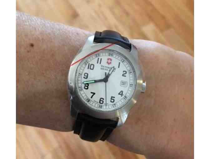 New in original box, classic Swiss Army watch features a white dial, date and genuine leather strap.  Item model number: 24995.CB