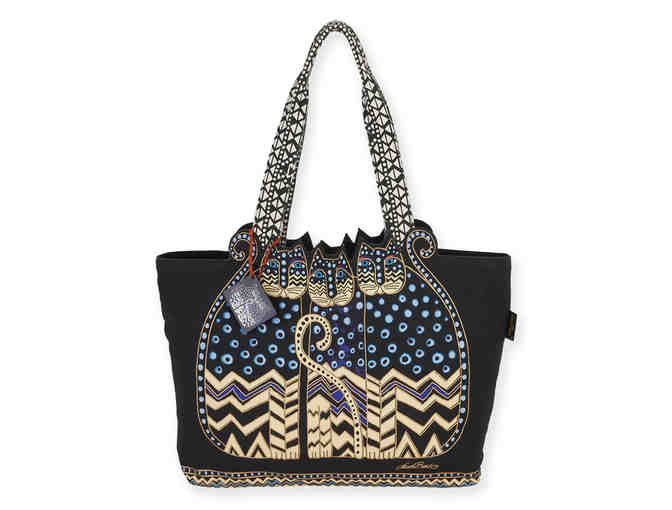 Sport a cart-full of cat fancy with this classic Laurel Burch tote. Its ample interior offers generous space while its playful facade flaunts mingling patterns and fanciful felines.