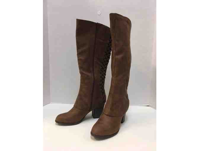 These knee-high boots have side zipper closing and a lattice pattern up the back. Designed to give extra room in the calf area. Features a 3" heel, man-made materials, size 8M, color is called cognac. Made by Fergalicious by Fergie.