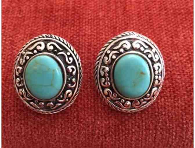 Pretty sterling silver earrings. They are oval shape with turquoise-colored stone set with an outer rope design surrounded by scrolls.