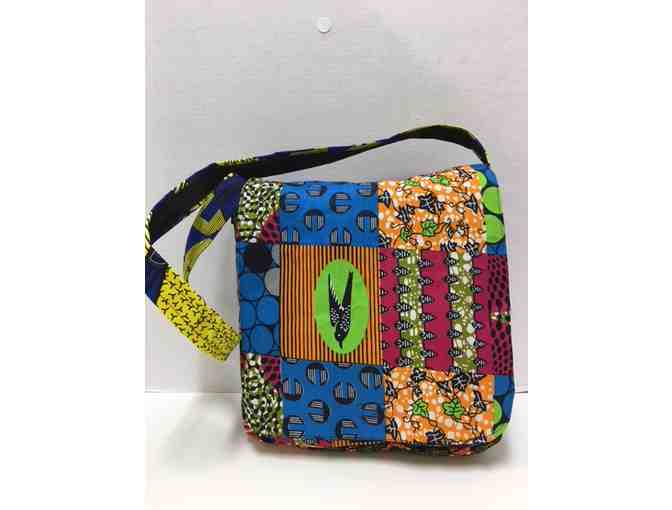 Messenger style bag with front zipper and shoulder strap made of beautiful Ghanaian cloth. Reinforced cloth makes a sturdy bag with a convenient velcro closure on the front. Large enough to fit your computer and school books or files for work.