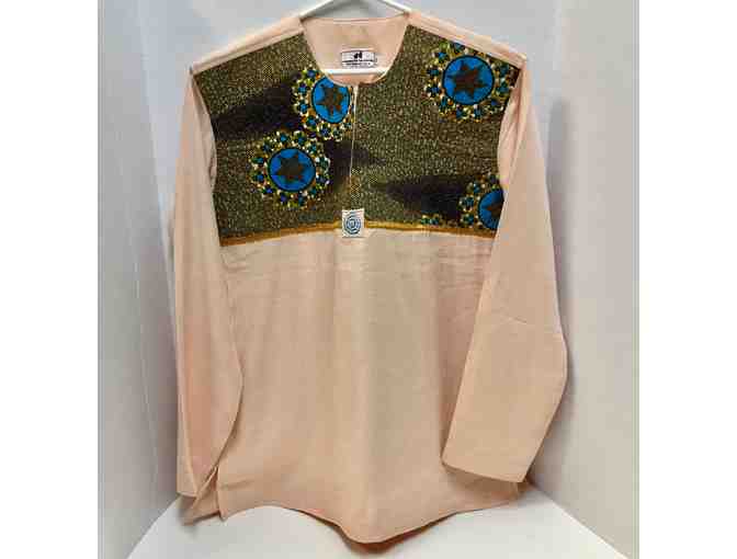 Handsome men's dress shirt designed by a WMI Scholar with quilted Ghanaian cloth yoke.