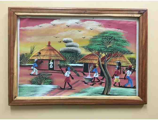 This unique acrylic painting on canvas depicts  village life in Zimbabwe. People go about their daily chores, such as carrying water, heading to work in the fields, winnowing, chopping wood and carrying thatch to fix a roof. The painting also underscores the traditional division of labor in a village - some tasks are only done by women and some by men.  The artist did not sign his or her work. Comes with a wood frame, that has outside measurements of 25.5"  x  18".