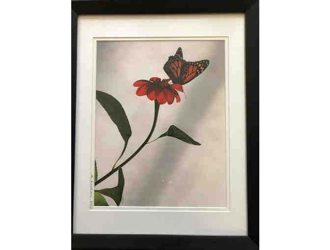 You are bidding on a matted and framed 11" x 15" photograph titled "Butterfly on Flower" taken by INSIGHT volunteer Russell Kushner. The frame measures 18" x 22".