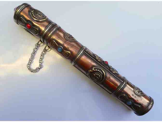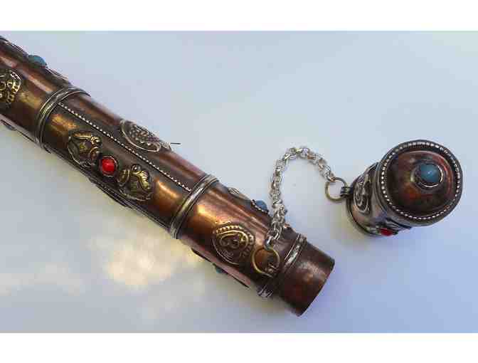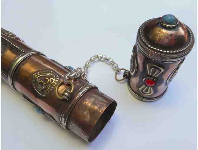 This ornate Tibetan incense holder from Himalayan Traders is accented in brass with sacred symbols. It has the OM mantra that is revered by Buddhists as well as the Vajra Dorje symbol.