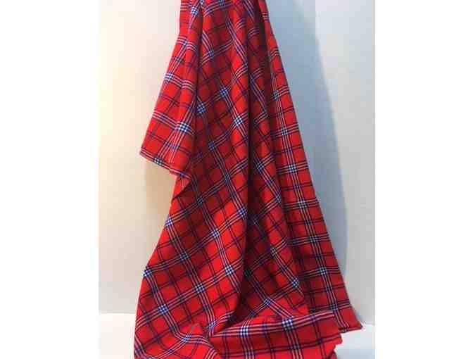 Masai Shuka material is traditional cloth that can be used as a lightweight blanket or a large scarf/wrap. This vibrant cloth is donated directly by a WMI Scholar for this auction. Cotton/Acrylic blend.