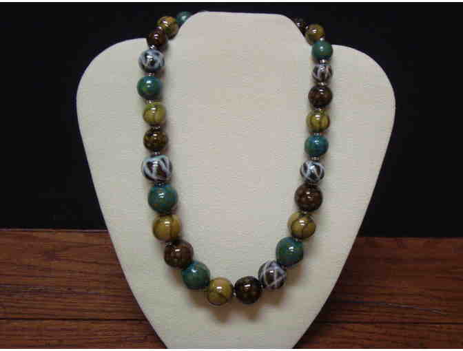 This 18" beaded necklace is handmade in Kenya. The Kazuri Company only hires single mothers and pays them a livable wage with benefits, which is not so common in Africa. The women form the beads from river clay, paint, fire, glaze and string the beads into necklaces, earrings and bracelets.