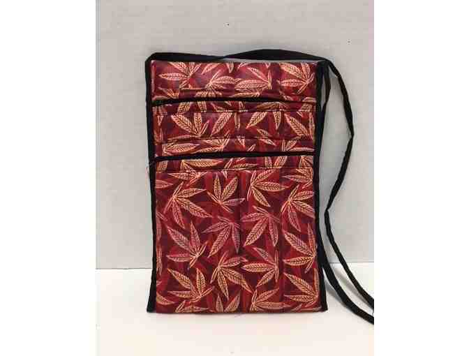Made of polished cotton fabric, this purse features two zippered pockets on the front. It is fully lined with a narrow shoulder strap.