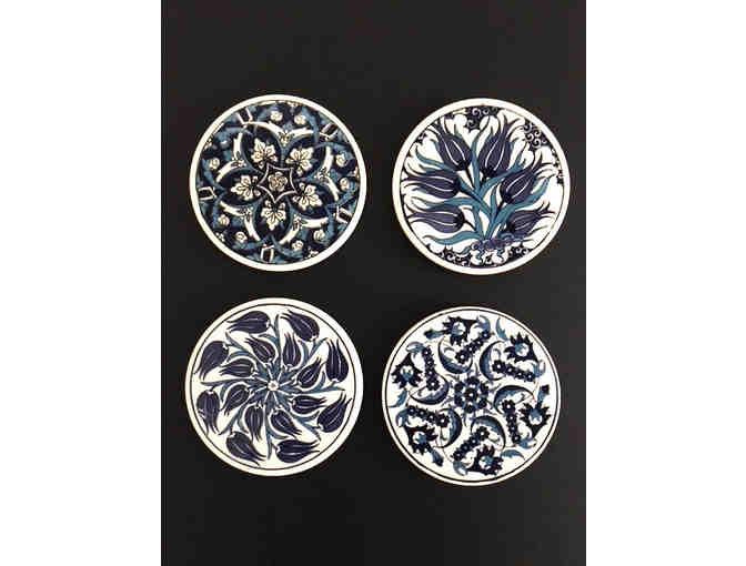 Lovely tile coasters featuring beautiful Turkish designs in blue. They are 3 5/8" in diameter and are backed with vinyl to prevent condensation.