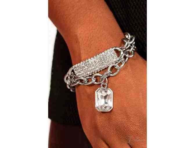 Rhinestones and large link silvertone chains give this bracelet plenty of attitude. Lobster claw clasp. Safety chain allows the size to be adjusted for a perfect fit.