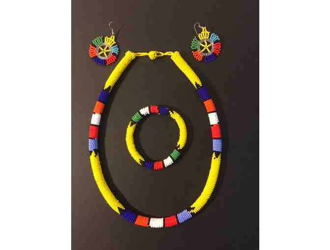 Make a statement with this beaded jewelry, handmade in Zimbabwe, typically worn by women of the Maasai tribe. The set includes a necklace, bangle bracelet and earrings.