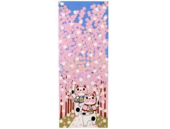 Neko-Chan offers bidders this Sakura Cats tenugui with two maneki kitties strolling through the cherry blossoms.